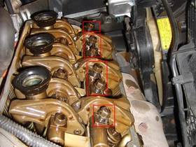 Die 3 Blau umrandeten Kerzenstecker ziehen und die 7 Schrauben (rot) des Ventildeckels entfernen.