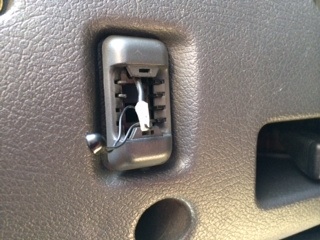 e) Fühler einbauen , dabei die Fühlerplatte von der Innenseite durch die Verkleidung führen, sonst ``=xxx und auch die Plastik- Kabelhalterung (weißer Knips in die Verkleidung gesteckt) nicht abbrechen