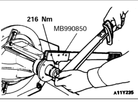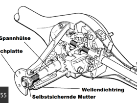 Die Flanschplatte gemäß Zeichnung einfetten, und wieder auf die Welle setzen. Möglichst so, dass die Markierung wieder zu der Markierung an der Kardanwelle passt! Dann die Mutter wieder drauf und festziehen, Drehmoment gemäß Zeichnung, und natürlich wieder mit dem Gegenhalter gegenhalten! (Um die Spannhülse nicht weiter zu stauchen habe ich die Mutter lediglich mit 180Nm angezogen, sie ist ja selbstsichernd.)