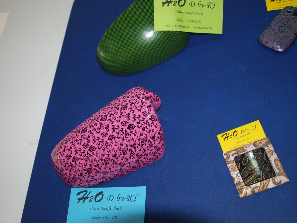 Gibt das Ganze auch mit Struktur. Das Muster wird auf die Folie gedruckt. Die wird dann auf die Wasseroberfläche gelegt, mit einem Aktivator besprüht damit sich die Trägerfolie auflößt und danach die Teile eingetaucht. Im Prinzip überträgt man nur die Hauchdünne Farbschicht.