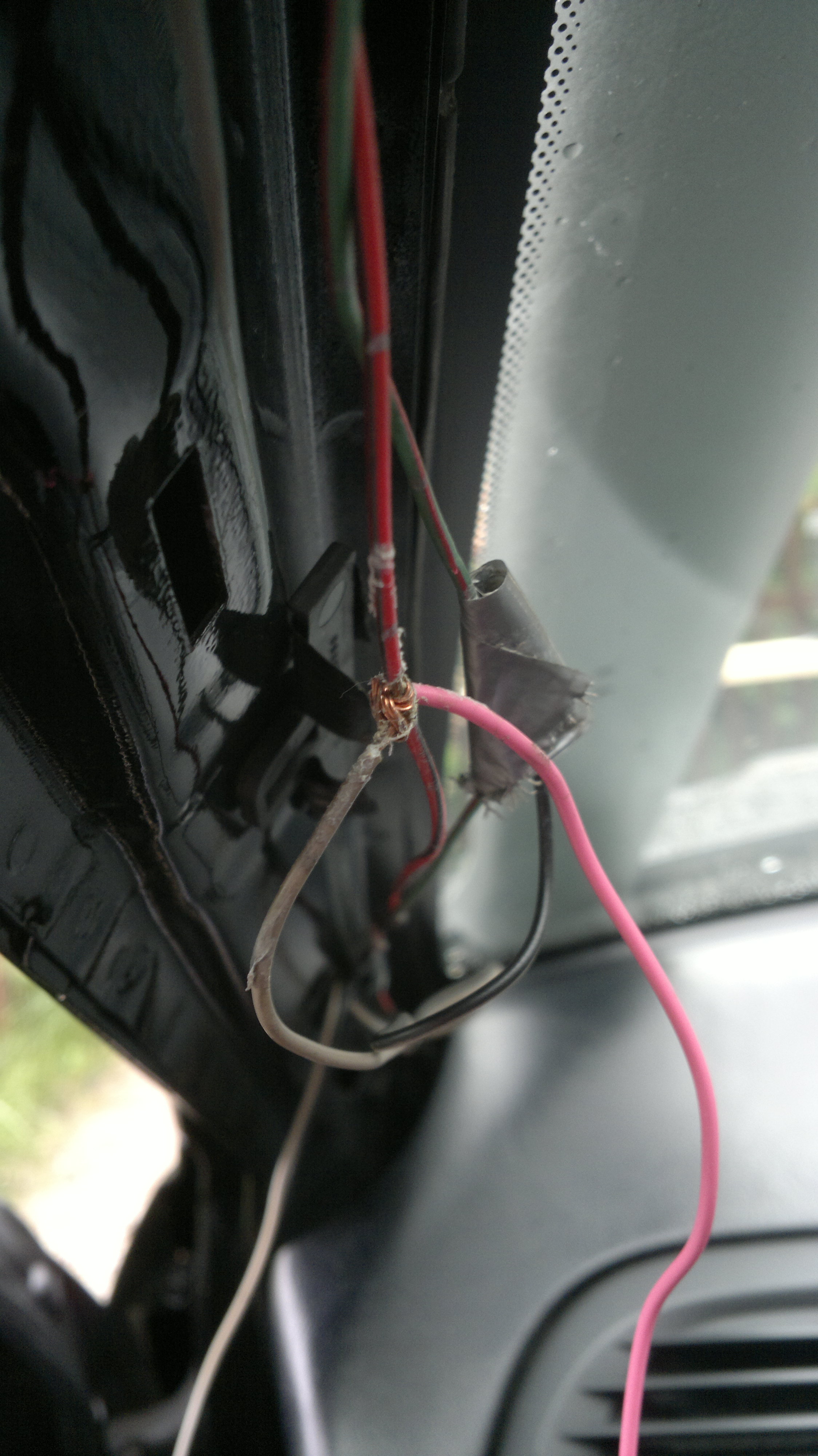 Im Zuge des Hifiumbaus haben wir noch einigen Kabelschrott aus dem Auto geholt. Hedges wunderte sich über die abgeschnittenen Kabelenden im Beifahrerfußraum und bekam daraufhin eine gewischt. ^^ Nach Kabelverfolgung haben wir festgestellt, dass ebenso ein Kabelende im Fahrerfußraum hing und weiter in die fahrerseitige A-Säule verlief. Nach Demontage dieser trauten wir unseren Augen kaum welch ein Pfusch uns da geoffenbart wurde. $wooow