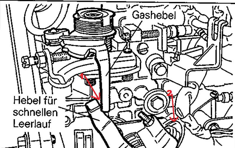 Der Pfeil 1 zeigt den Schnellleerlaufhebel. Der muss den Gashebel berühren, respektive nach hinten wegdrücken. Da darf KEIN Spiel sein bei KALTEM Motor.