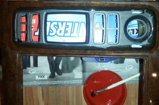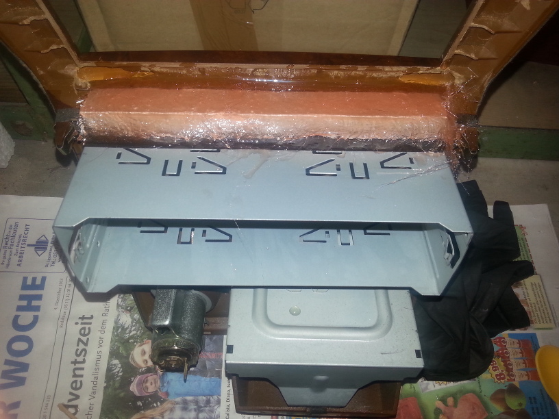 Heute morgen habe ich aber mal wieder was ausprobiert. Der Ausschnitt des ehemaligen Brillenfachs, wo das Radio rein soll, hat einen zu überbrückenden Spalt. Ausserdem mußte ich mir überlegen, wie ich den Radiorahmen vernünftig festkriege, die obere Kante fehlt nämlich völlig.