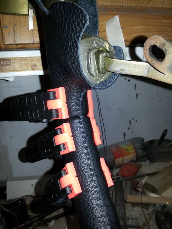 Also 2 Uhrmacherschraubendreher genommen und mehrmals - Schlaufe für Schlaufe - die Nähte nachgestrafft, bis die Lederkanten sich rundum berührten. Als das geschafft war, hab ich die Enden verknotet und die Ränder, da, wo das Leder an den Speichen zuende ist, mit Pattex verklebt. Dann noch eine erste Schicht Pflegewachs aufgetragen und fertig war der Lack.