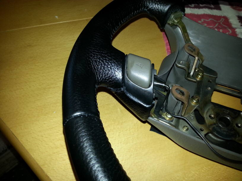 Dann den neuen Bezug auf das nackte Lenkrad gewürgt und die Stellen angezeichnet, wo die 4 Nähte sitzen. Bezug wieder runter und am Lenkrad die so markierten Stellen mit einem Cuttermesser rundum abgeschnitten. Den Bezug wieder drauf gewürgt und die Nähte in die so entstandenen Spalten versenkt, damit sie nachher keine Beulen werfen. -