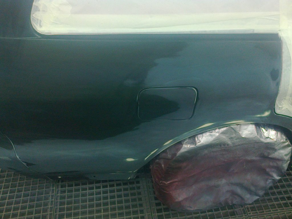 Der Spangler der auch zugleich Lackierer ist, ist ein Freund meines Bruders der mich auch letztendlich überzeugte die arbeiten von Ihm ausführen zu lassen. Da alles in einer Hand bleibt. Farbe und Klarlack hab ich noch hier besorgt und mitgenommen. Der Spangler wusste das wir kommen würden und das wir auch für 2 Wochen bleiben werden er also keine Eile haben muss. Was Ihm ganz recht war den wie es schien hatte dieser alle Hände voll zu tun. Ein Haufen unangekündigter Arbeit stand bei Ihm auf dem Hof, an manchen Tagen arbeitete Er an bis zu 5 Fahrzeugen gleichzeitig um Zeit zu Gewinnen sich meinem Gali besser widmen zu können. Dabei blieben leider die Bilder auf der Strecke, dennoch hat er es geschafft hier und da ein Bildchen zu knipsen. Von den Rep.Blechen war Er begeistert, Er habe noch keine Bleche verbaut die sich so schön Schweißen lassen. Auch die Passform sei Perfekt. Er hat die Reparatur nach dem Minimalst Prinzip durchgeführt. Heißt so wenig wie nötig altes Blech von der Karosse schneiden, dies habe den Vorteil das wenn irgendwann wieder was zu machen sei am Radlauf könne nochmals aus geschnitten werden. Wenn Er das gesamte Blech gleich wechsle könne später nicht mehr nach geschnitten werden. Sofern dies überhaupt von Nöten sein sollte aber besser Vorsorge als Nachsorge...