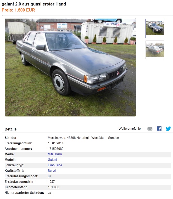 Falls jemand einen gepflegten Galant E10 aus Erstbesitz sucht, mit angeblichen 100 Tkm. :thumbup: