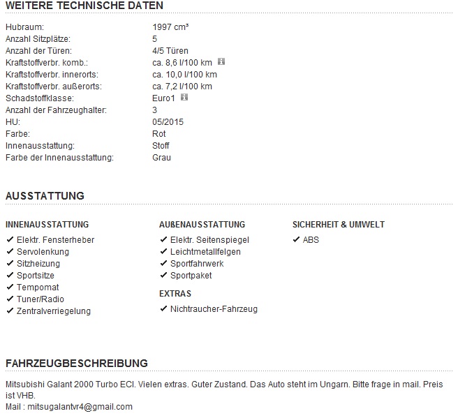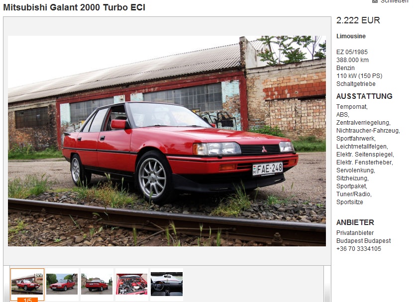 Ich verkaufe schweren Herzens meinen seltenen Galant. Das Schmuckstück hat mir sogar 2012 den auf dem Foto dargestellten Pokal erworben! Ich denke mal, in diesem Super- Zustand gibt es keinen zweiten Galant! Der Grund, warum ich meinen Galant verkaufen will ist, daß die Prioritäten jetzt bei der Familie liegen und mir die Zeit und auch das Geld fehlen, einen Youngtimer als Zweitwagen für den Sommer zu halten. Ich gebe ihn nur in Liebhaber- Hände ab! Der Wagen wurde in unzähligen Arbeitsstunden, restauriert. Ich muss den Wagen nicht verkaufen, also bitte keine unverschämten Angebote! Hier nun ein kleiner und annähernder Einblick was alles so passiert ist: - Gekauft 04/2011: 1000€ - Motor Überholung (mit Zylinderkopf Überarbeitung, mit neuer Wasserpumpe, neuen Riemen und allen Dichtungen usw. 04/2013: Ca. 2500€ - Die auf den Bildern zu sehenden Sportline Alu-Felgen mit Reifen und Eintragung 04/2011: 500€ - Neue Bremsleitungen + TÜV 2013: 330€ - Neue Bremssättel 02/2013: 400€ - Lackierarbeiten (4 Türen, Kotflügel, Heckklappe) 04/2012: ca. 1500€ - Sonstige Reparaturen+ Ersatzteile (Kupplungsgeber/Nehmer, Bremsscheiben usw.) ~500€ Ich habe noch ein riesiges Ersatzteillager für diesen Wagen, was ich ebenfalls mit im Preis inklusive übergebe würde ( neue und gebrauchte Ersatzteile ) : ca. 2000€ Ich lass preislich mit mir reden, wenn ich ein gutes Gefühl habe in wessen Hände das Schmuckstück gehen würde! Auf E-Mails von "was ist letzter Preis" reagiere ich nicht!!!!