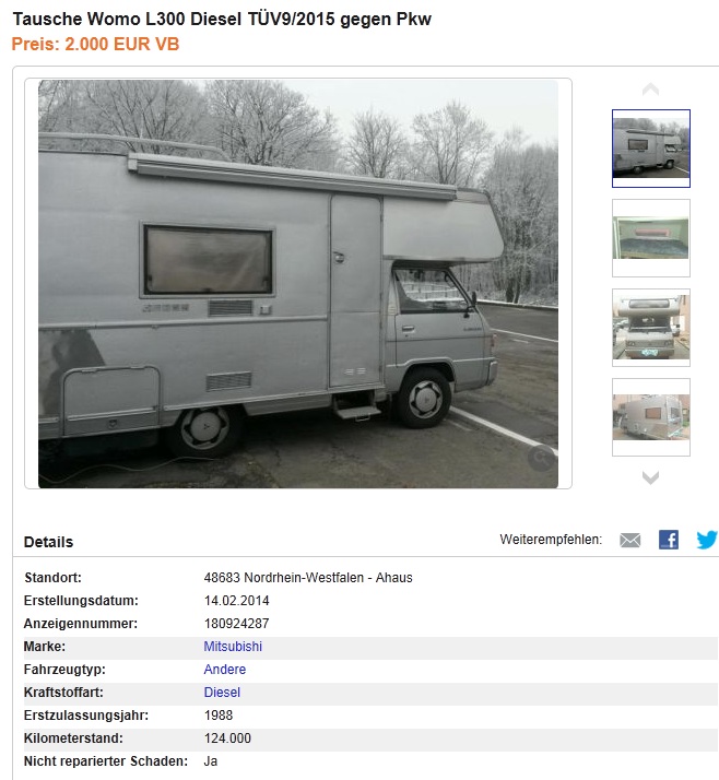 Wieder ein L300 Womo für 2.000 € oder im Tausch gegen einen PKW. Ich finde das Womo sieht gar net schlecht aus.