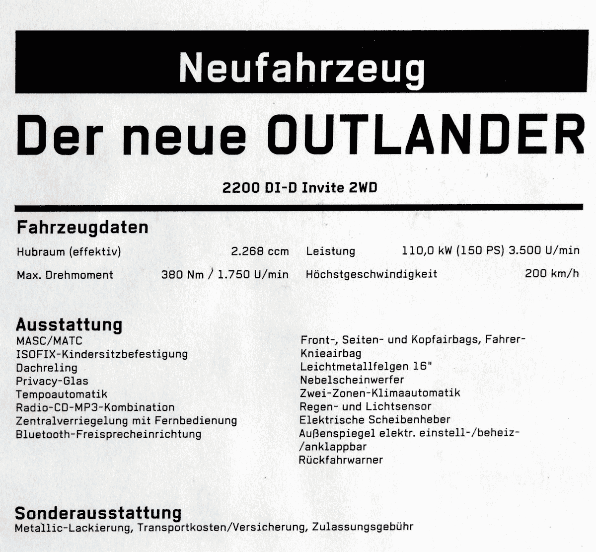 Anbei mal das Datenblatt bzw. die Ausstattungsliste des Invite.