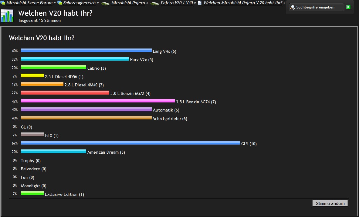 Ich würde gern mal wissen welche Pajero V20 hier vertreten sind. Dazu mal eine kleine Umfrage. Es kann niemand (auch die Mod´s nicht) sehen wer was angegeben hat, der Datenschmutz ist also gegeben.
