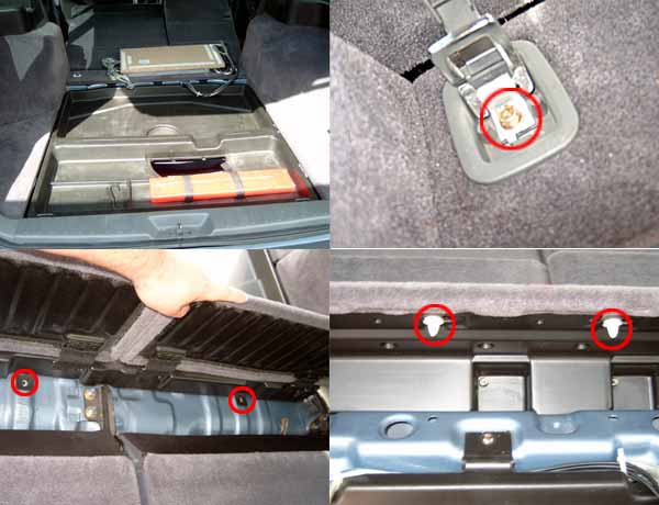 Danach die Ösen fürs Gepäcknetz o.ä. an dem Teil zwischen den Radkästen abschrauben. Plastikabdeckung ein wenig nach oben hebeln und nach hinten klappen. Danach die Öse hoch und die Sechskantschraube lösen. Das nun lose Gebilde aus Öse, Schraube und diversen Einzelteilen kann man einfach herausnehmen. Jetzt Sitzlehnen umklappen und die Laderaumüberbrückungsklappe von innen leicht anheben. Die Befestigungspunkte sind im Bild zu sehen. Zum Schluss noch das Teil vom Blech trennen, es sind nur noch zwei Klipse.
