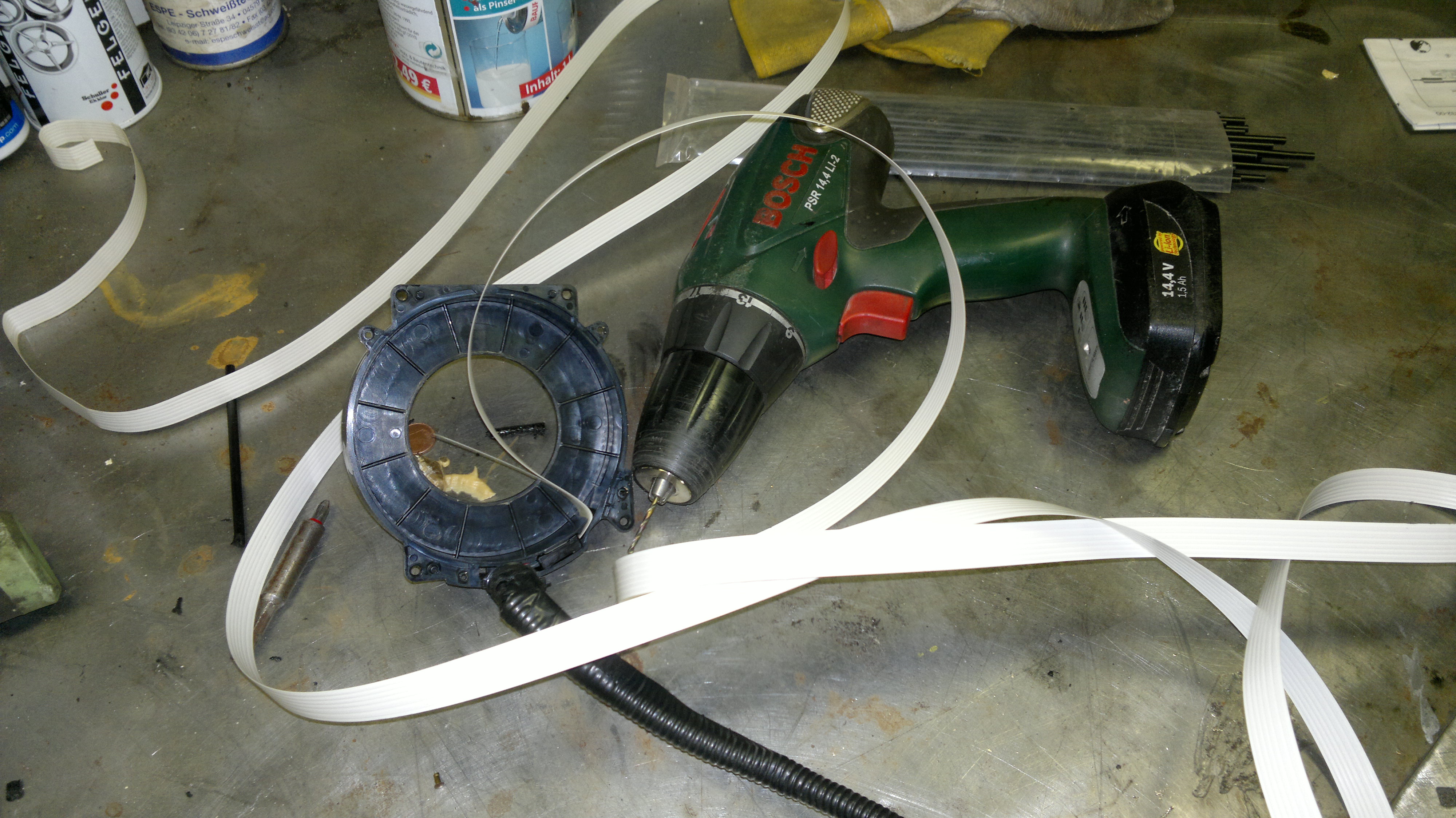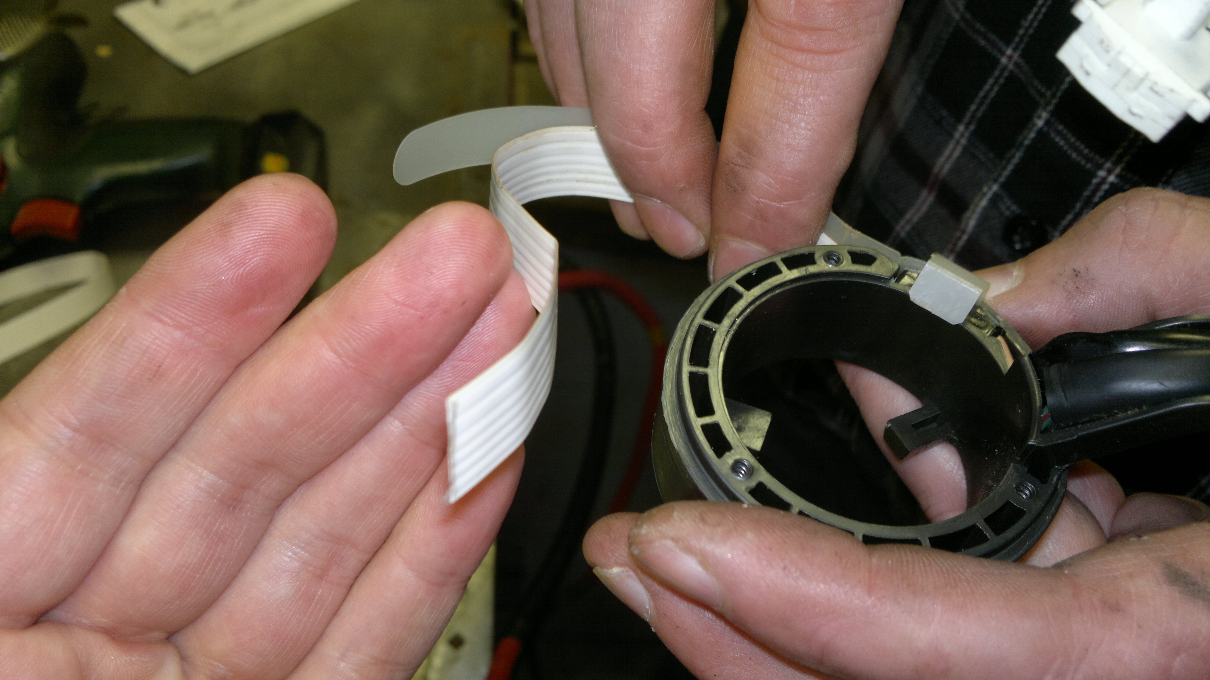 Wir haben also paar Sachen an der Lenksäule demontiert, damit wir an die Leitungsenden der Wickelfeder kommen und wollten erstmal durchmessen. Wenn hier bereits der Fehler liegen sollte könnte man sich den Ausbau des Mitteltunnels sparen und bräuchte nicht das SG testen. So haben wir gedacht und gemacht. Wie sich auch schnell herausstellte war der Fehler auf die Wickelfeder zu begrenzen, da wir keinen Durchgang messen konnten. Also die WF noch ausgebaut und die Nieten aufgebohrt. Im Inneren des Federkranzes werden die Leitungen für Airbag, Hupe, Tempomat und auch für das Bedienelement vom 3000GT über ein weißes Flachband flexibel gemacht. Hier war das Band zerissen. Die Wickelfeder ist also restlos im Eimer.