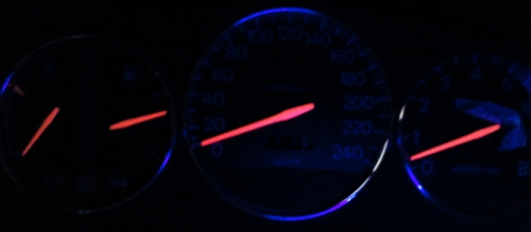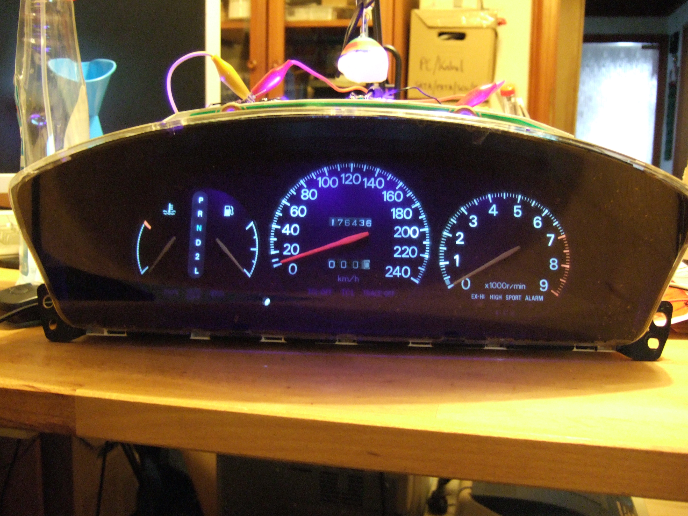 EL Folie zurechtschneiden und ganzflächig hinter den Tachoscheiben kleben.