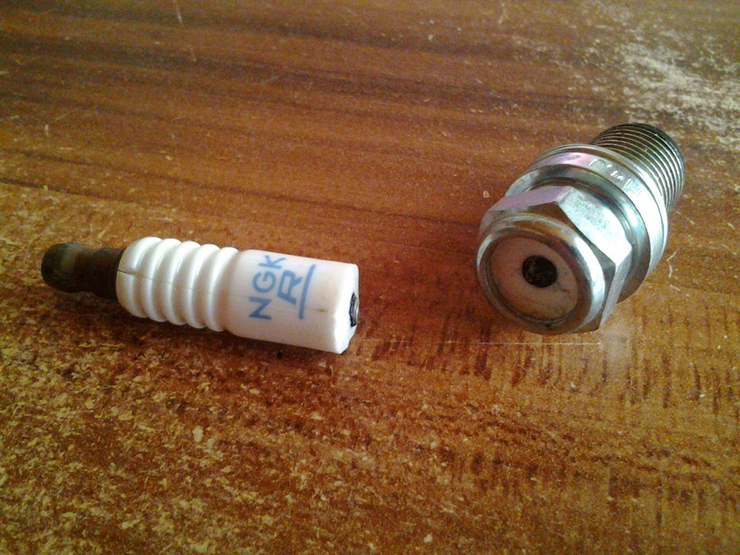 Ganz einfach, durch einen ungeschickten Mechaniker. Der Kerzenschlüssel wurde beim reinschrauben der Kerze nicht gerade gehalten sondern beim festziehen verkantet. Dadurch wurde er schiefgezogen und der Isolator abgebrochen.