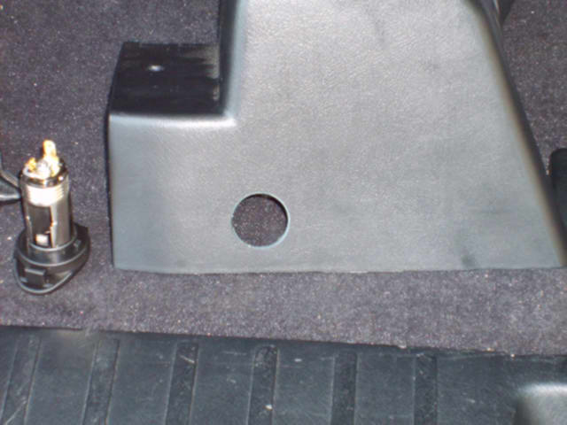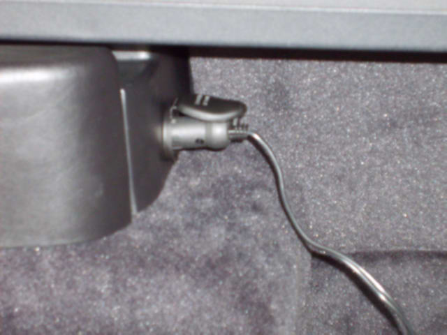 Das zweiadrige Kabel, an dem einen Ende mit Kabelschuhen versehen (habe ich vorher gemacht), wird nun aufgesteckt. Dann kann die Domverkleidung, jetzt mit Dose; wieder an ihrem Platz eingebaut werden. Das Kabel habe ich nun unter der Sitzfläche, Richtung Mitteltunnel verlegt, um an den Zigarettenanzünder von vorn zu kommen. Um nicht so fummeln zu müssen, habe ich den Mitteltunnel gelöst (die zwei 12 Schrauben). Nun das Kabel bis zur Mittelkonsole vor ziehen. Damit es leichter geht, habe ich die Schaltverkleidung, Dosenhalter bzw. Heizungsschalter und Ablagefach unter der Armlehne enfernt.