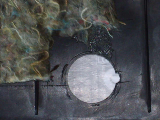 Nun habe ich mit einem Messer noch den Ausschnitt für die Fixierung gemacht. Wie ihr sehen könnt, muss auch noch ein Stück vom Dämmfilz weichen. Hier sind auch die zwei Stege zu sehen, auf die ich mich bezog, beim messen.
