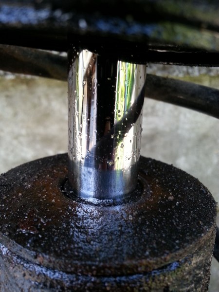Ein Nivomat ist beim anheben an der Kolbenstange undicht. Das Öl spritzt in einem ganz feinen Strahl raus mit Schaumbilung.