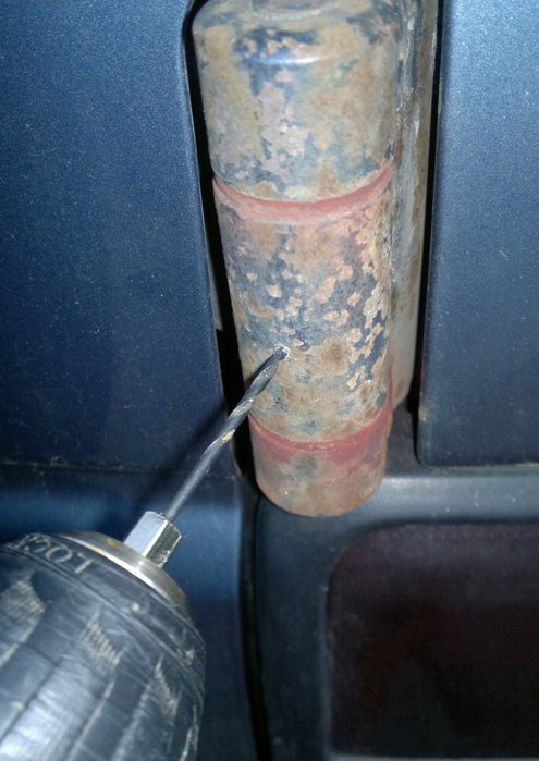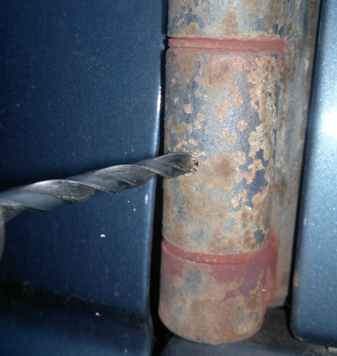 Ich seh ja am Bohrer dass ich zur Hälfte durch bin, und spätestens da müsste ich doch auf den Bolzen gestoßen sein. Ich kann die Tür sogar noch bewegen wenn der Bohrer komplett drin steckt. D.h. da drinnen bewegt sich nichts.