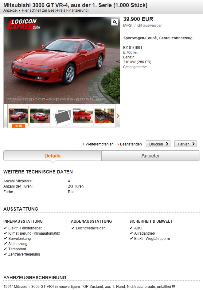 "Für Tiefstapler: exklusiver Youngtimer in Japanqualität aus der Porscheklasse in exzellentem Zustand. Mitsubishi 3000 GT, Zustand 2 bis 2+, zeitgenössisch modifiziert usw usw "