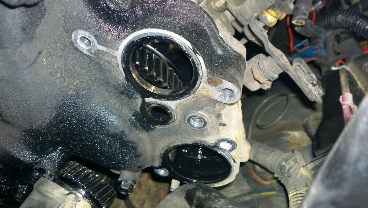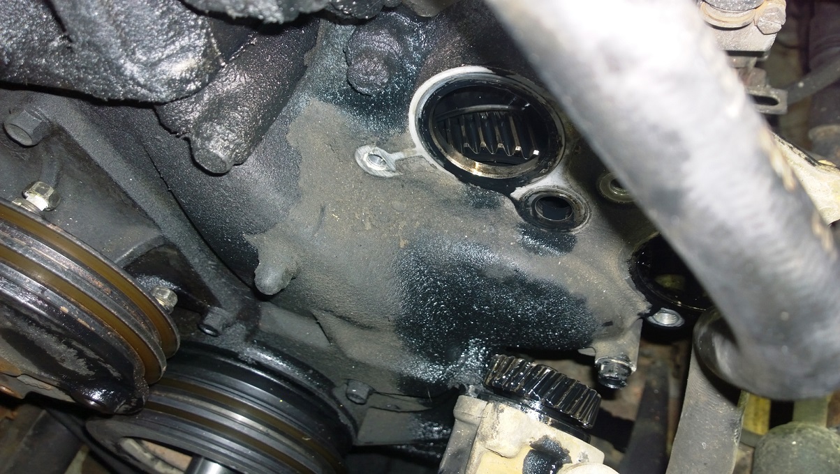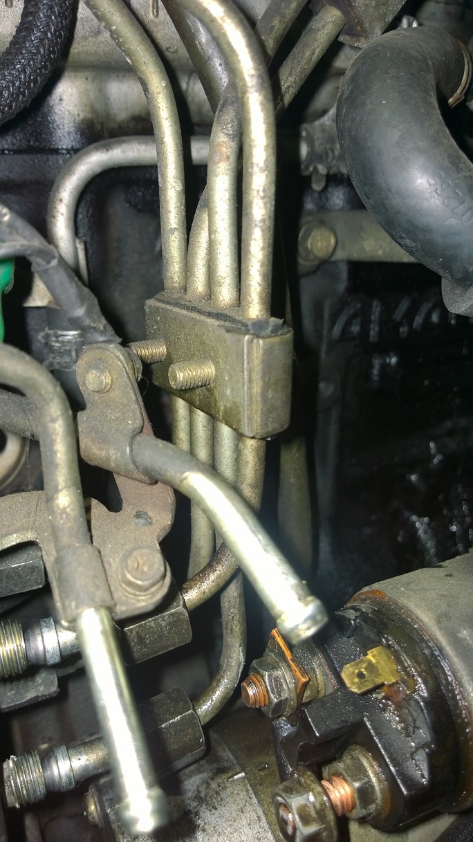 Danach an die Vorderseite, die Unterdruckpumpe und die Servopumpe weggeschraubt. Die Unterdruckpumpe hat eine Leitung für Schmieröl, die hab ich entfernt. Kupferdichtscheiben nicht verlieren! Danach die Unterdruckschläuche von der Unterdruckpumpe ab, und die ganze Pumpe weg. Auf den Dichtring achten! Die Servopumpe, da hab ich nur die Befestigungen der Leitungen gelöst, Pumpe raus, Dichtring sichergestellt, und Pumpe hängen lassen.Dann die restlichen Schrauben die die Montageplatte der Einspritzpumpe raus. Und jetzt an die Schrauben unter der Pumpe, an dem Winkel. Die Kabel am Anlasser stören, also abklemmen. Dann mit der Verlängerung und der 14er Nuss drunter, und die Schrauben raus. Pumpe ist lose, aber die Kraftstoffleitungen zu den Einspritzdüsen halten sie noch. Also die Überwurfmuttern an Pumpe und Düsen lösen, und die Verbindungen zwischen den Leitungen raus. Sehr langsame und kniffelige Sache. Dann die Leitungen eine nach der Anderen raus. Die Pumpe nach hinten schieben – und jetzt den letzten Wasserschlauch an der dem Motor zugewandten Seite der Pumpe abmachen. Fertig, sie ist draußen! (Blöd, dass ich nicht damit gerechnet hab, dass jetzt Kühlwasser ausläuft – etwa 2Liter sind ausgelaufen).