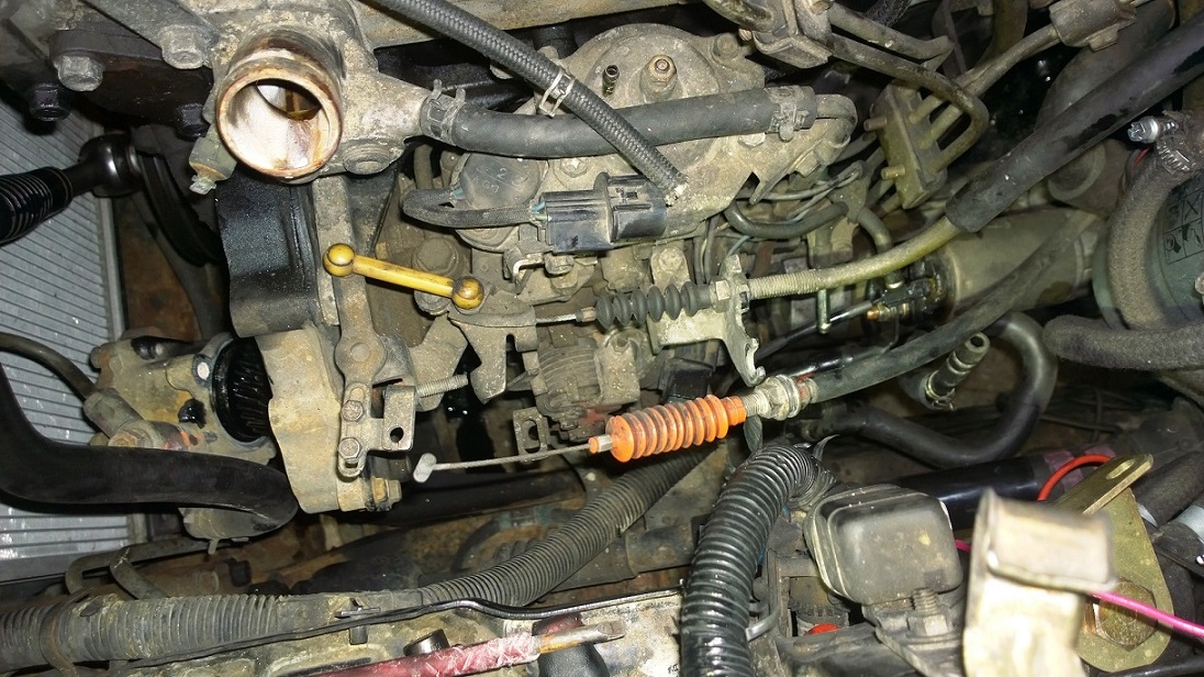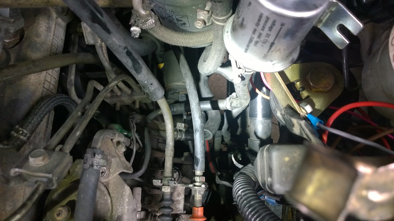 Dann hab ich mal angefangen die Schläuche und Kabel die an die Pumpe dran gehen, zu entfernen. Bei den beiden Kabeln gleich den ganzen Kabelbaum, da sind noch zwei kleine Stecker und der Kabelschuh für die Glühanlage dran – danach kann der ganze Kabelbaum weg und ist aus dem Weg. Der obere Wasserschlauch, den Unterdruckschlauch und die Kraftstoffschläuche ab. Dann die beiden Seilzüge.