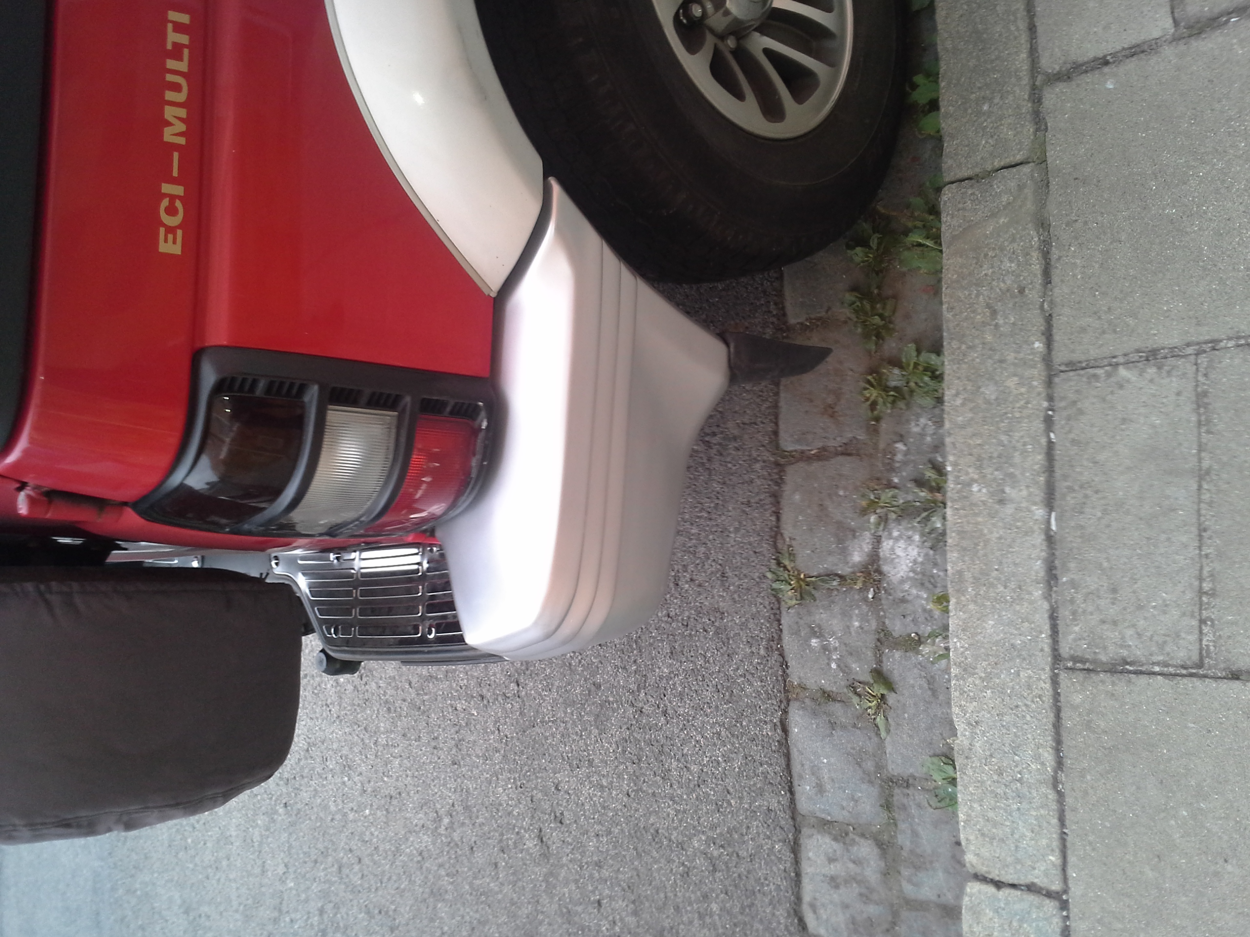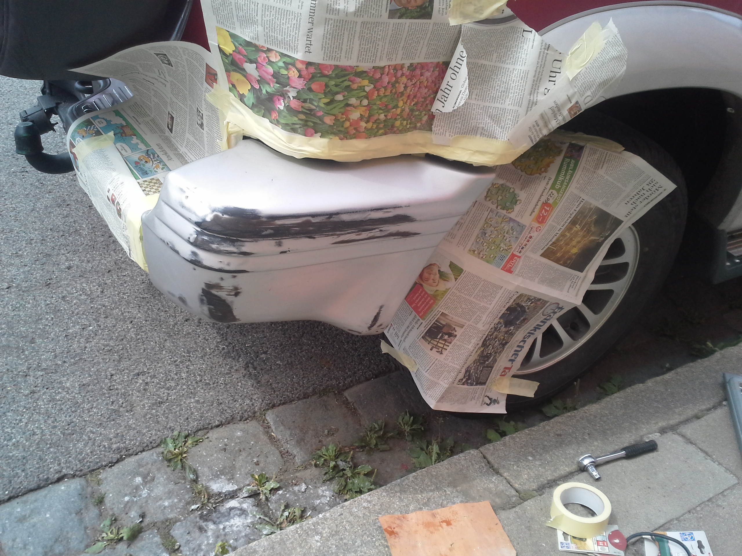 Zum Schaden kam es als ich eine Hofeinfahrt rückwärts in Dunkeheit hochgefahren bin, dann noch etwas zu schnell und guckte zu lang in den linken Spiegel und als ich in den Rechten umschwank, sah ich schon die Betonmauer bedrohlich nahkommen. Das abbremsen kam da leider auch zu spät. Alles halb so schlimm. Die Stoßstangenecke hat paar Kratzer abbekommen. Und als ich die Kratzer ausbesserte, machte ich mich gleich über alle vier, da die restlichen vom Vorbesitzer angefahren und nur lieblos drübergesprüht wurde.
