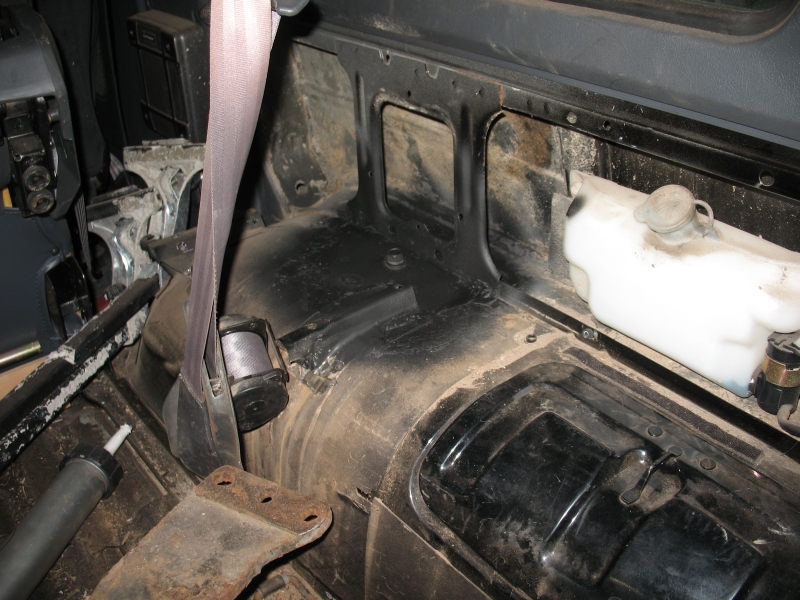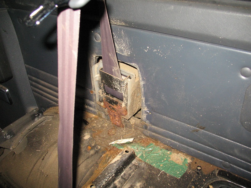 Wenn das dann drin ist, legt manvon innen den Gurt an die Stelle, wo er hin gehört. (da gibt es ein kleines Loch im Fahrzeug und einen kleinen Stift am Gurt, dann findet man das schnell zusammen. Anzeichnen und das Loch für den Gurtaufnahmepunkt bohren. Nebenbei eine Platte mit 2mm Stärke und den Maßen von ca. 10cm x 10cm herrichten und ebenfalls dort in der Mitte ein Loch bohren. Dann die Platte in das Radhaus legen und mit einer alten Schraube fixieren. (geht leicht, da das Schiebefenster einen zweiten Mann erspart)