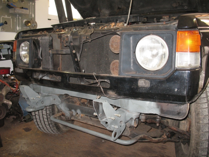 Nachdem der Weg zum Rost frei war, konnte ich alles abschrauben, was da so dran und rostig ist. Die Front war gleich mal zerlegt. Der Rahmen im Frontbereich abgeschliffen oder mit der Drahtbürste behandelt. Wie man halt hin kommt. Dann mit Zinkgrundierung gut dick eingesprüht, da kann das auch mal laufen. Is ja ein Rahmen und kein Außenblech.