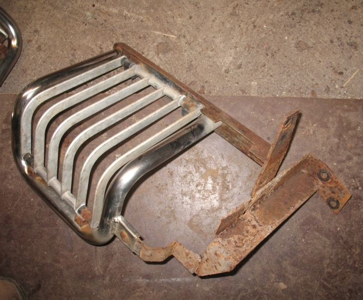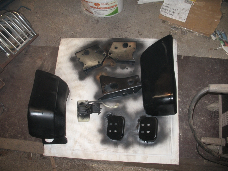 Dann hab ich mal angefangen die Frontstoßstange um zu bauen. Die Chromstoßstange aus England ist ca. 8cm links und rechts breiter. Somit passen die Halter der Stoßstangenecken nicht mehr. Also mit der Flex einen sauberen Schnitt und ein ein dickes L-Eisen reingeschweißt. Das sollte halten! Alle Halter entrostet, grundiert und lackiert - fertig. Alles schön zusammen schrauben und viele neue Schrauben rein. Sieht gleich ganz anders aus!