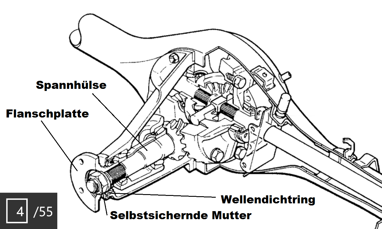Anschließend die Kardanwelle abflanschen, und mit einem Draht so aufhängen dass sie aus dem Weg ist. Die Mutter die dann in der Mitte zum Vorschein kommt gilt es zu lösen....