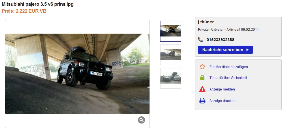 Der Verkäufer ist ein Russe (Händler bei mir ca. 1 KM wech) und geht bis 3300 runter. Ich werde mir den morgen anschauen !!!!!!! Aber der hat jetzt neuen (russischen) TÜV..... Und das schwarz matt gerollt entstellt den armen Pajero auch !!!!! :cursing: :cursing: :cursing: