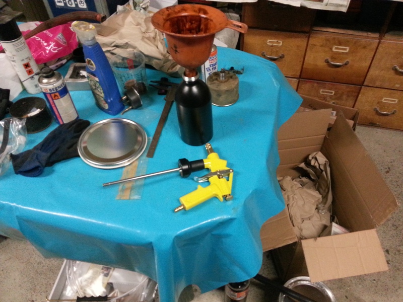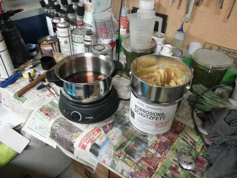 Geplant war ein Ölwechsel, Reinigung des Unterbodens und Konservierung. Dazu hatte ich eine Grundausstattung Mike Sanders bestellt, die bei noch angenehmen Temperaturen im/unter dem Auto verteilt werden sollten.