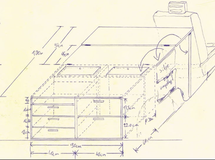 Im hinteren Bereich, soll ein Unterbau hin, der die Höhe der umgeklappten Bank ausgleicht und 5 Euroboxen aufnimmt.