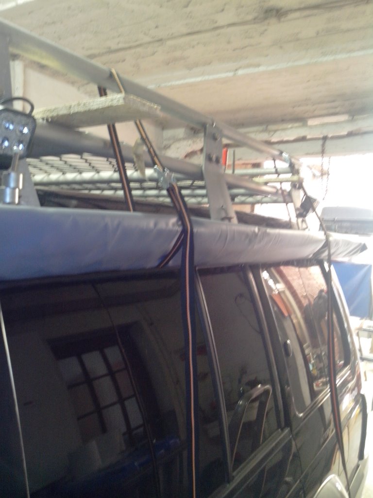 Also einfach zwei kleine Spanngurte am Dachträger befestigt und abwechselnd rechts und links hochgezogen.