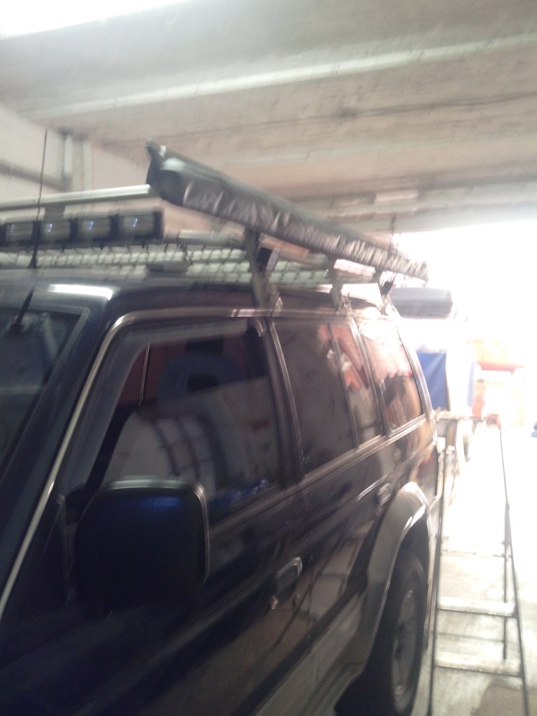 Dann mit zwei Schraubzwingen zwei Bretter am Dachträger befestigt, wo ich die Markise dan raufheben kann.