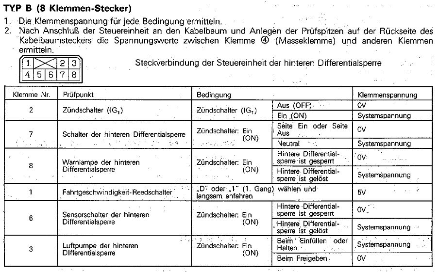 So, nu wirds eklig. Meiner Einschätzung nach wird da alles soweit richtig und gut angesteuert. Entweder ist der Sensorschalter im Diff kaputt oder aber der Aktuator im Diff hält den Druck in Endstellung nicht und bläst den ins Diff. Ich tendiere mehr zum Aktuator, da ansonsten der Drucksensor im Kompressor abschalten müsste, was er ja in der ersten Phase einwandrei macht. Sicherheitshalber bitte anhand des angehängten Bildes am Steuertier messen.