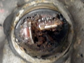 Leider sieht das Ding zum Einen ziemlich verkokelt aus, zum Anderen aber auch so aus als wäre der mit irgendeiner Pampe eingesetzt.