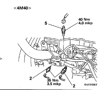 Der 4M40 hat nur einen Kühlmitteltemperaturgeber für die Anzeige und das Steuergerät der Glühanlage, im Bild die Nummer 5. Die anderen beiden sind für die Klimaanlage.
