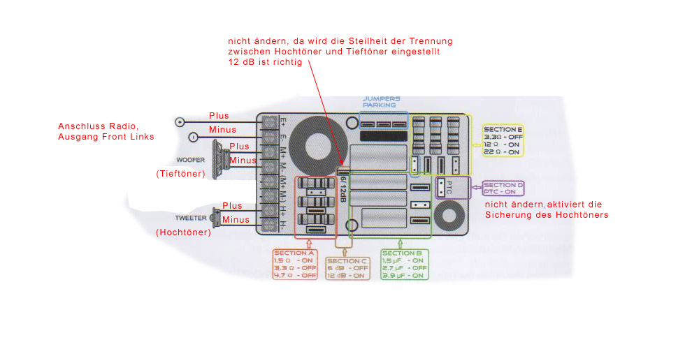 Nicht so weiter machen, Du hast mindestens einen gravierenden Fehler eingebaut, der zumindest die Hochtöner gefährdet. Die Lautsprecher dürfen nicht ohne Weiche betrieben werden, tiefe Frequenzen zerstören oder schädigen die Hochtöner. Wenn das jemand heraus bekommt, dann ist die Garantie hin.