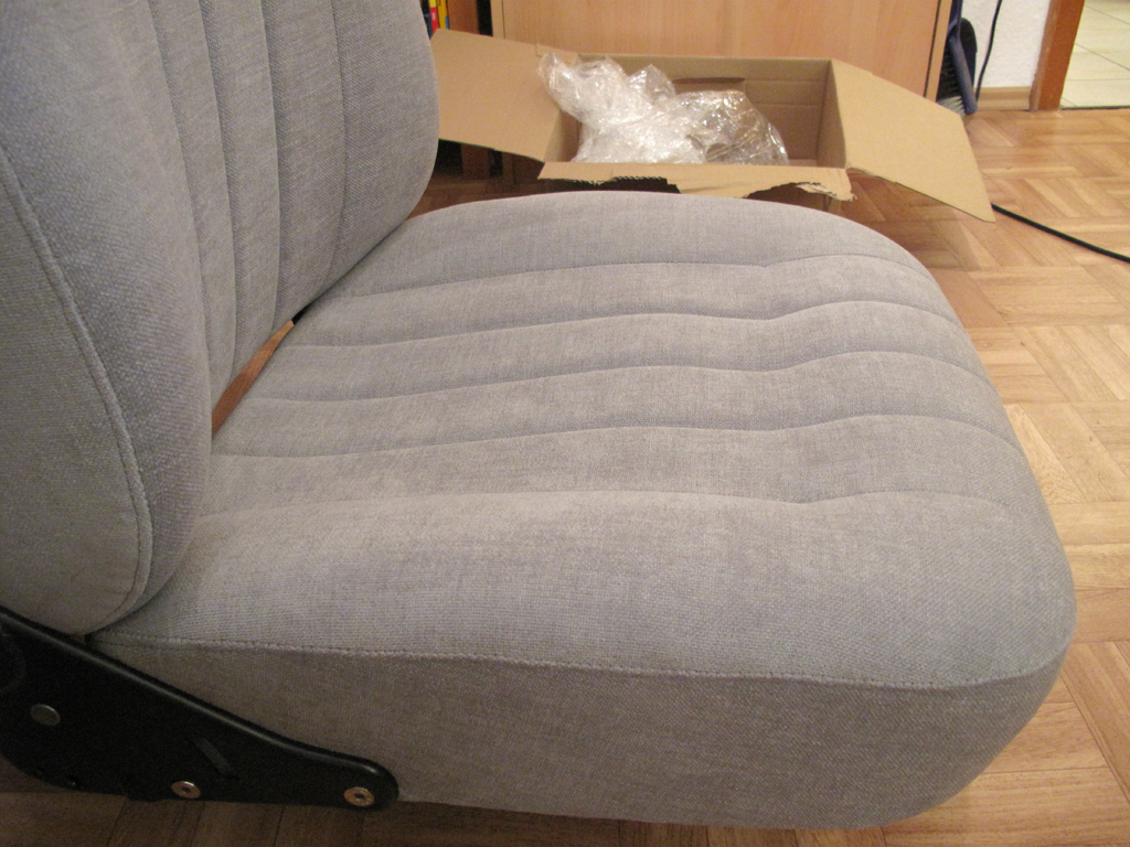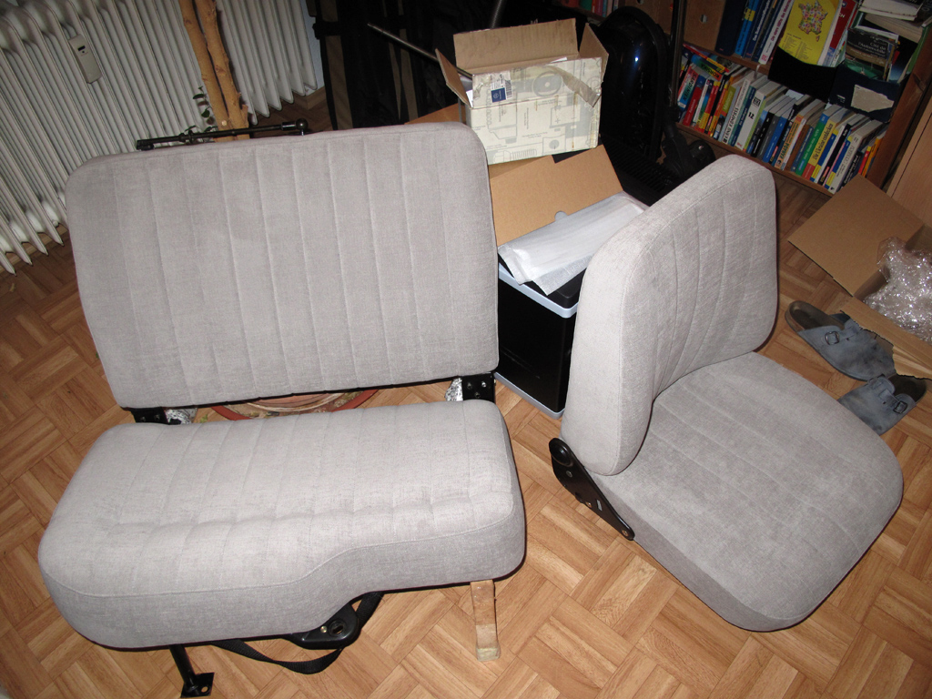 Hab heute die Sitze abgeholt. ... Das grüne Plasikleder wurde einmal hübsch "zivilisiert" und ähnlich dem Pajero in leichtem grau und in Stoff realisiert.