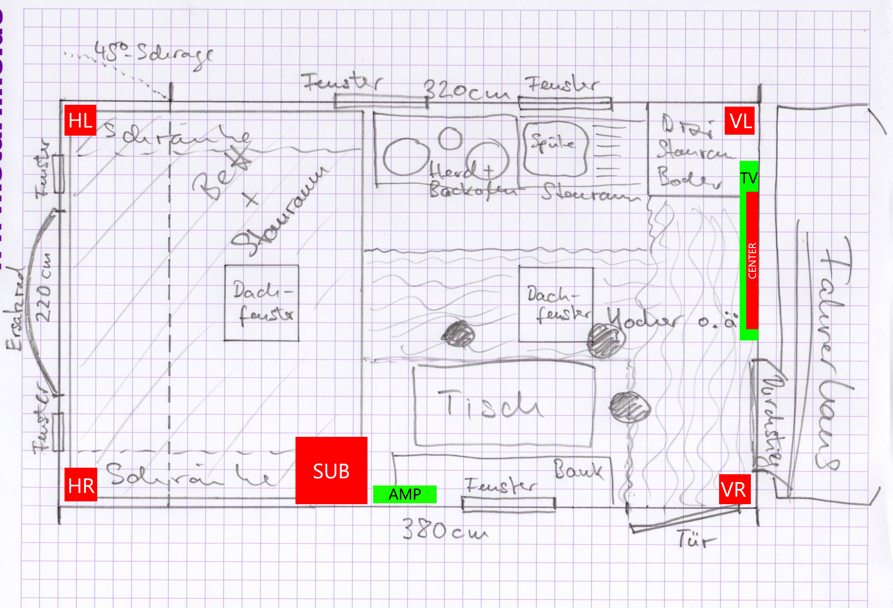 So hier der Grundriss mit einer frühen Idee zur Musik/TV-Anlage...