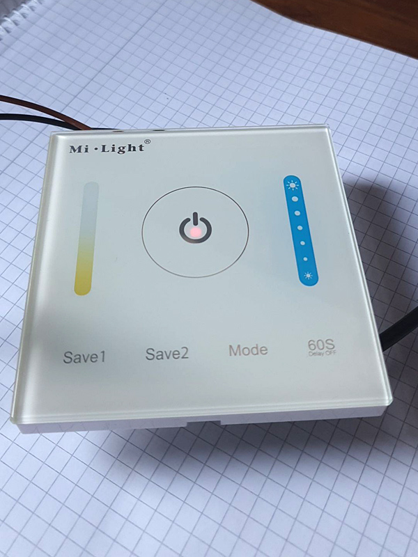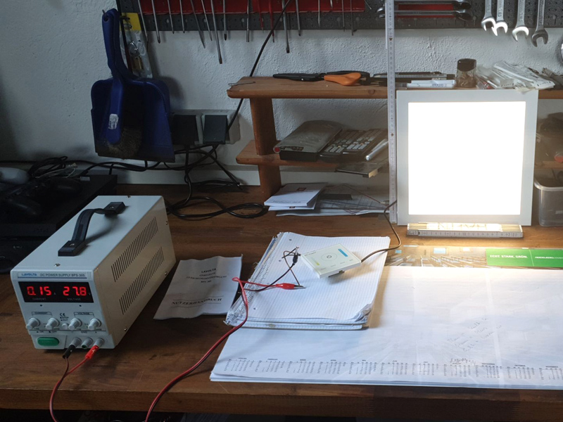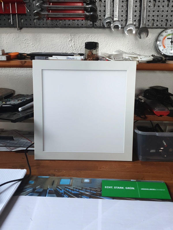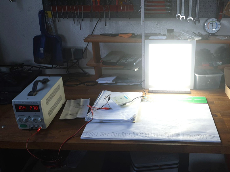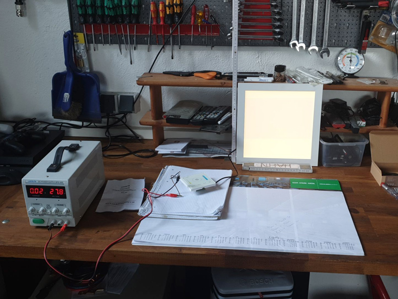 Nach etwas gemeinsamer Recherche und seinem Vorwissen habe ich dann zum Spaß was zum Testen eingekauft: 24V LED Panele mit 2 LED-Streifen, Warmweiß (rötlich) und Kalrweis (bläulich), dimmbar...