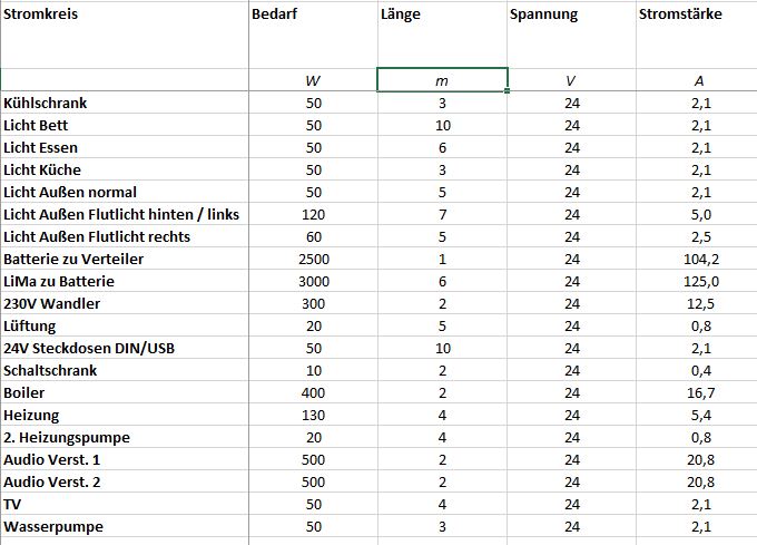 Die Tabelle ist noch viel größer (Querschnitte, Farben, Formeln, etc.), aber für hier tut's das. Daraus ergeben sich schon mal benötigte Querschnitte, benötigte Kabel und Dicken, Sicherungen..., und ich versuche wie im KFZ mit vielen Farben zu arbeiten. Falls mal was sein sollte tut man sich bei der Fehlersuche unendlich viel leichter.