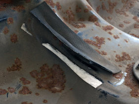 Am alten Tank ist ein spezielles Material in Streifen verklebt, dass ein Scheuern des Tanks an der darüber liegenden Karosserie abfängt.