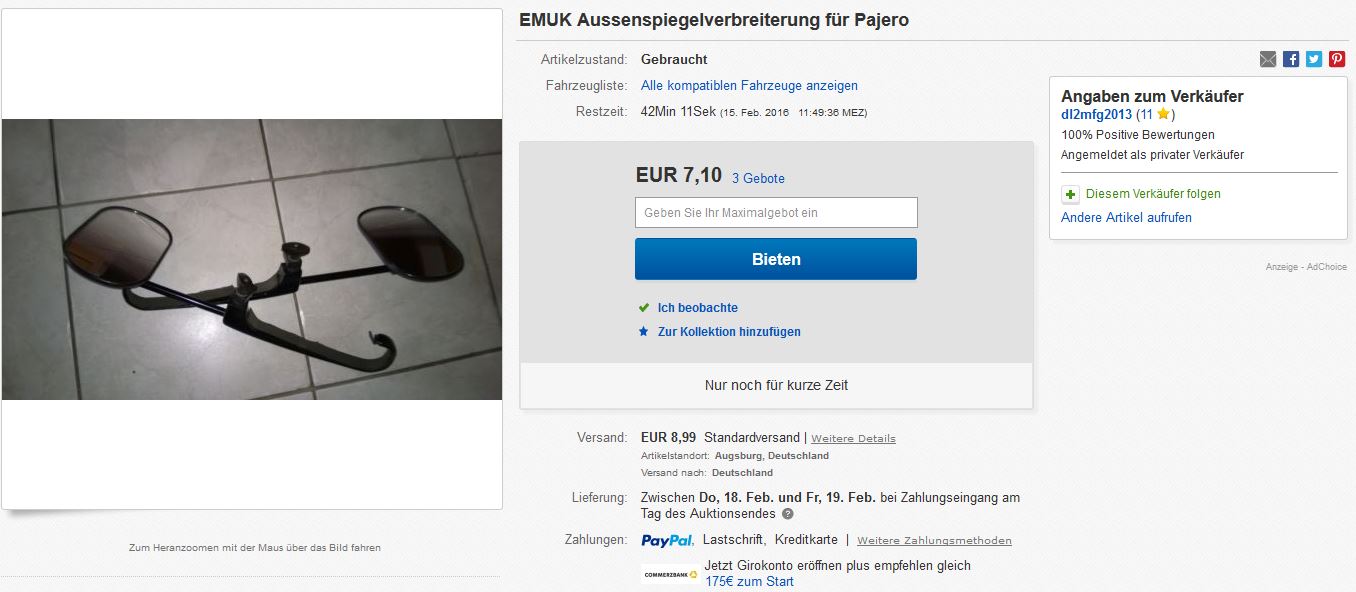 Auf Bild 2 sieht man, dass der eine Spiegel eine kleine angelaufene Stelle am Rand hat. Sie ist ca. 5 mm lang und geht 2 mm ins Glas rein. Sieht man aber aus dem Auto raus nicht.