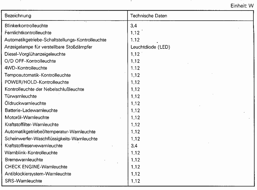 Da ich nicht gewillt bin jedesmal für eine Lampe 4€ zu zahlen (okay, kommt aus Japan) suche ich für die Tachobeleuchtung und die Anzeigen (Allrad/Türen/GDI/Gänge) die Bezeichnung der einzelnen Sockel.