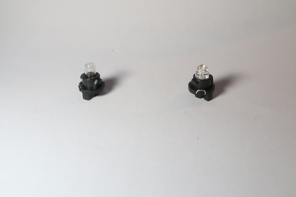 Es müssten insgesamt 3 Typen Glühlampen sein, vom aussehen her T3/T4,2/T4,7 (hab nur B8 4d gefunden im Handel). Ich finde aber auch dazu keinerlei Spezifikation, da hätte ich mal nachgemessen. Da ja eigentlich die Anzeigen nicht gedimmt werden könnte man die doch auch durch LED ersetzen, da halten die hoffentlich auch länger und sind weniger Stoßempfindlich
