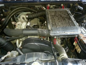 Der Intercooler muss runter. Der hat ein Schutzblech drüber und und ich empfehle das als erstes zu demontieren. Danach kommt man viel besser an die Schlauchschellen. Dann hab ich die 4 Schrauben des eigentlichen Intercoolers gelöst und die Schläuche abgezogen. Am Intercooler gibt es noch Steckverbinder für die Sensoren. Die müssen natürlich auch noch ab. Ein super Tipp aus dem Netz: den Intercooler mit Benzin spülen! Bei mir kam einiges an Dreck raus! Immer wieder rein schütteln ausgießen und von vorne. Am Ende kams klar wieder raus. Zur Sicherheit hab ich das Ding über Nacht ausdünsten lassen.