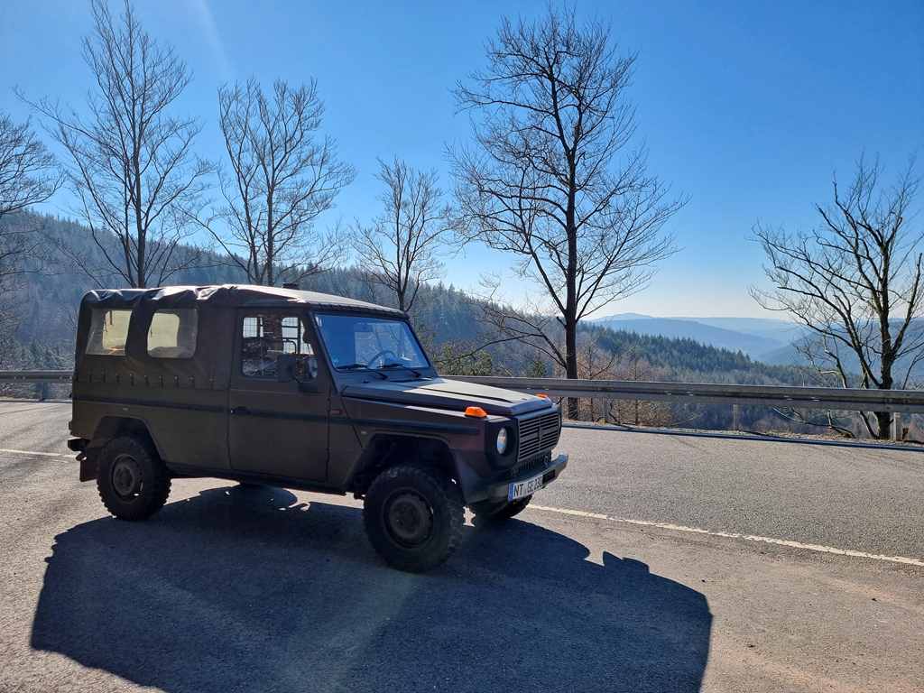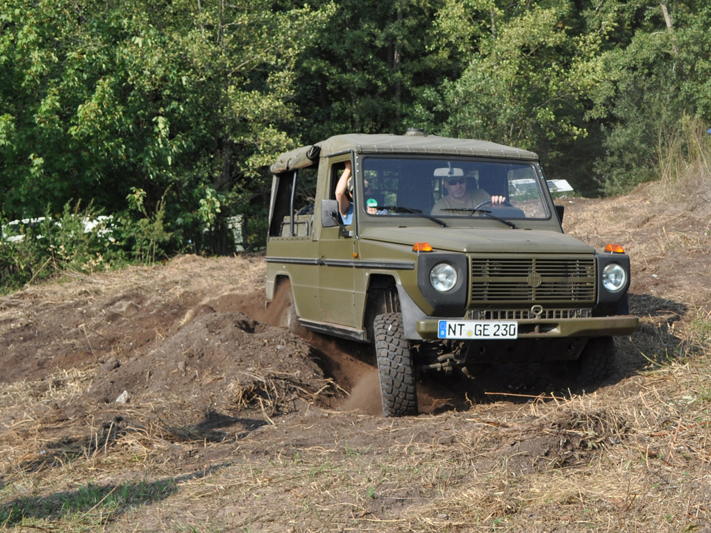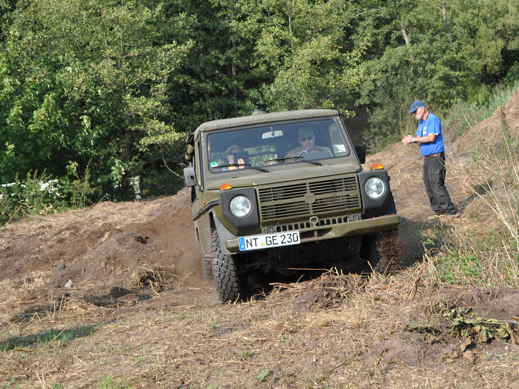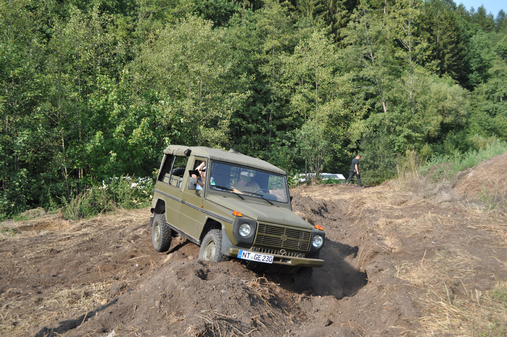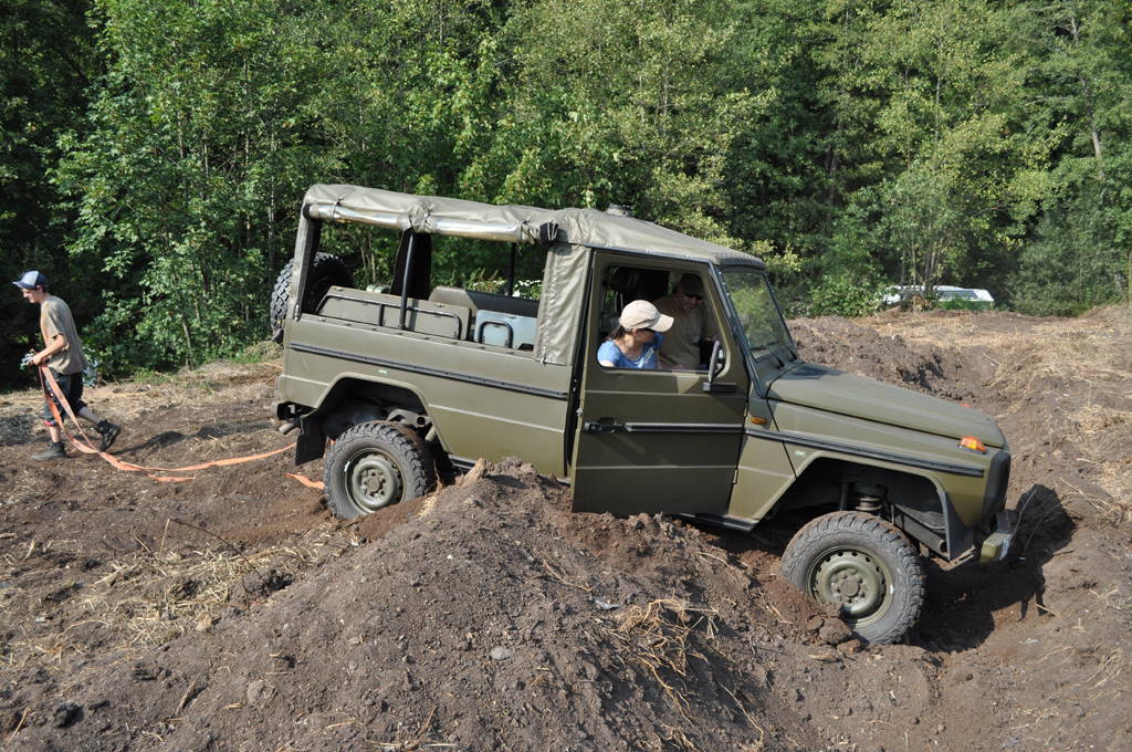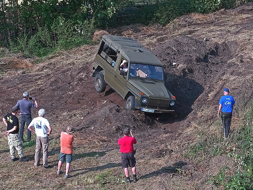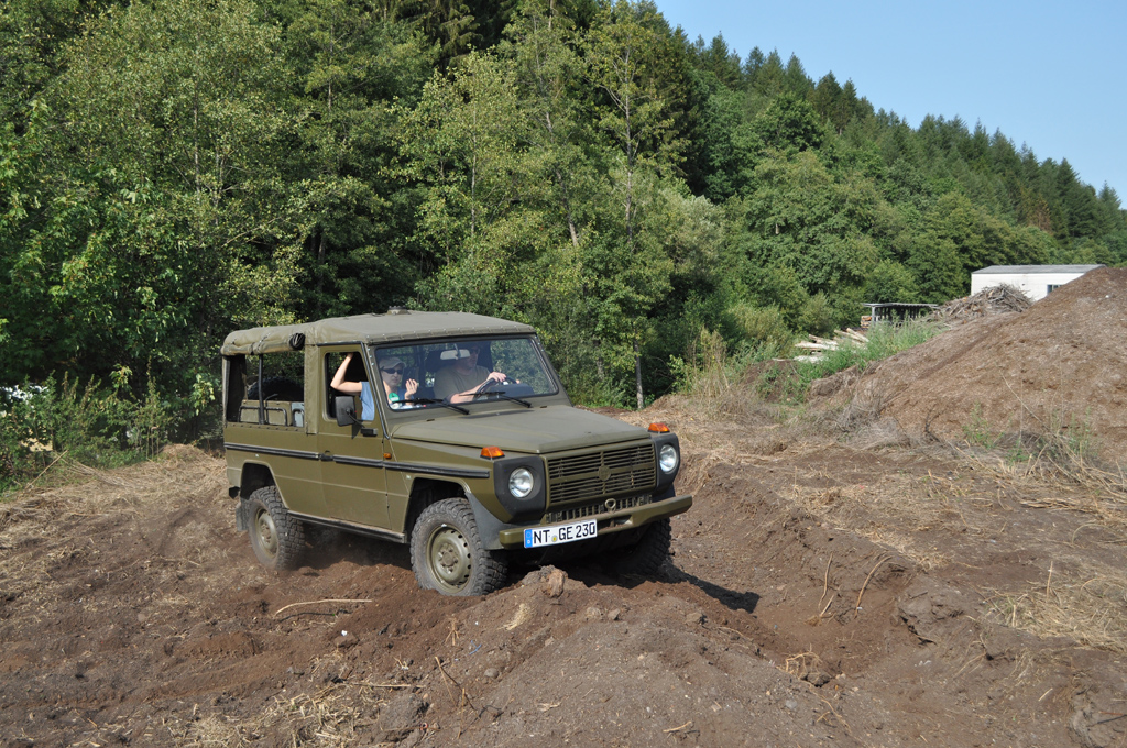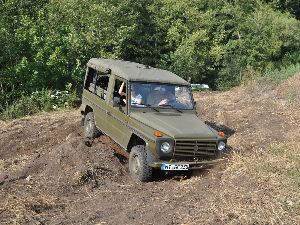 Hier der Puch, trotz der eigentlich wirklich guten Geländegängigkeit, sieht man gut, dass das Auto sich nicht wirklich verwindet und meist ein Rad in der Luft ist.